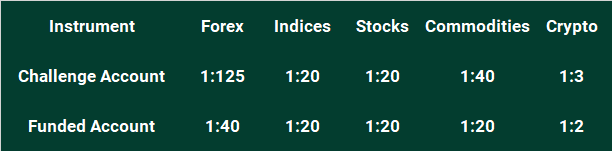 For specific leverage levels on trading products (Instruments), please see the following table: